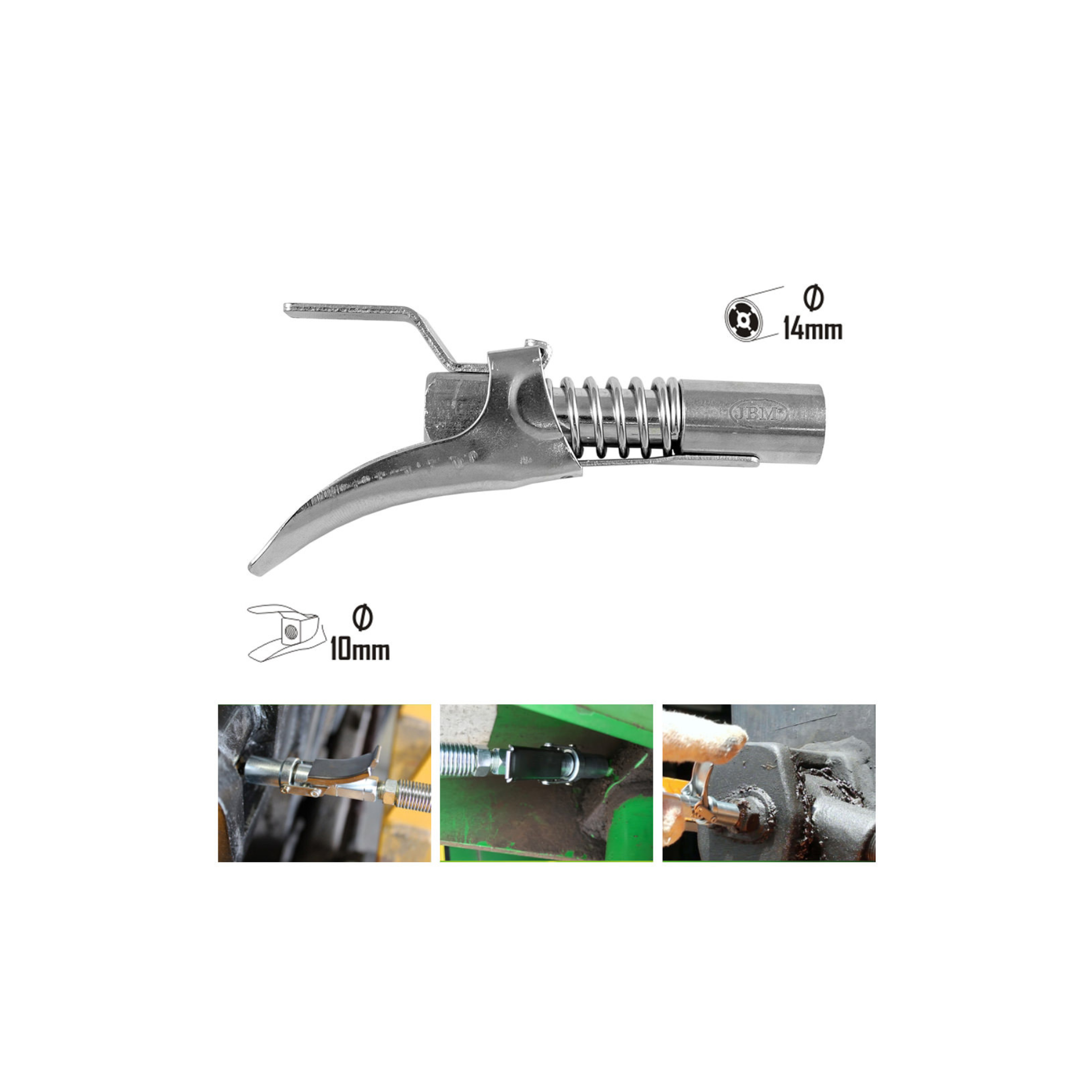 O equipamento JBM 53592 é um acoplador de lubrificação de liberação rápida, projetado para facilitar operações de lubrificação em ambientes automóveis, industriais e agrícolas. É compatível com a maioria das pistolas de graxa, incluindo os modelos JBM 50751 e 50852.