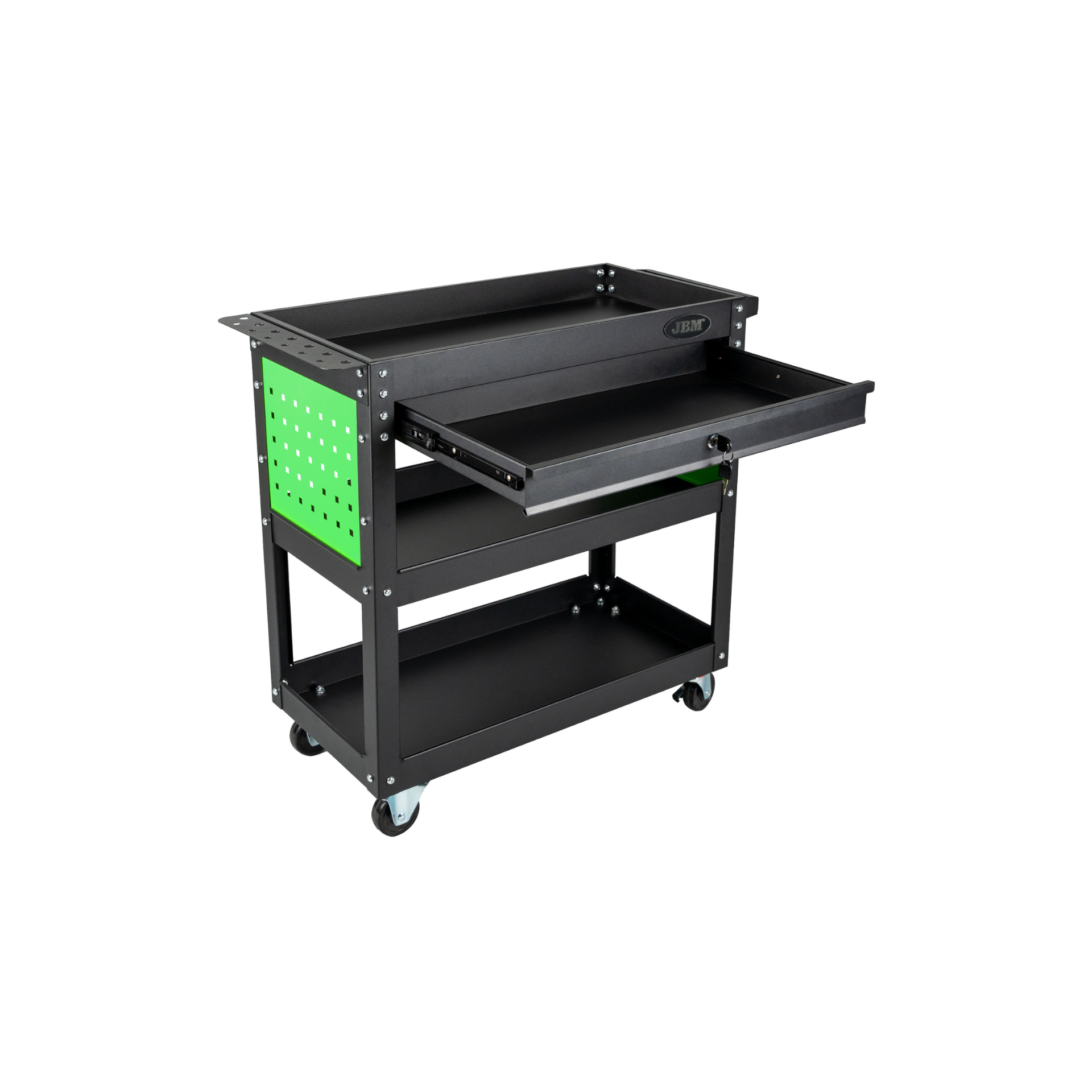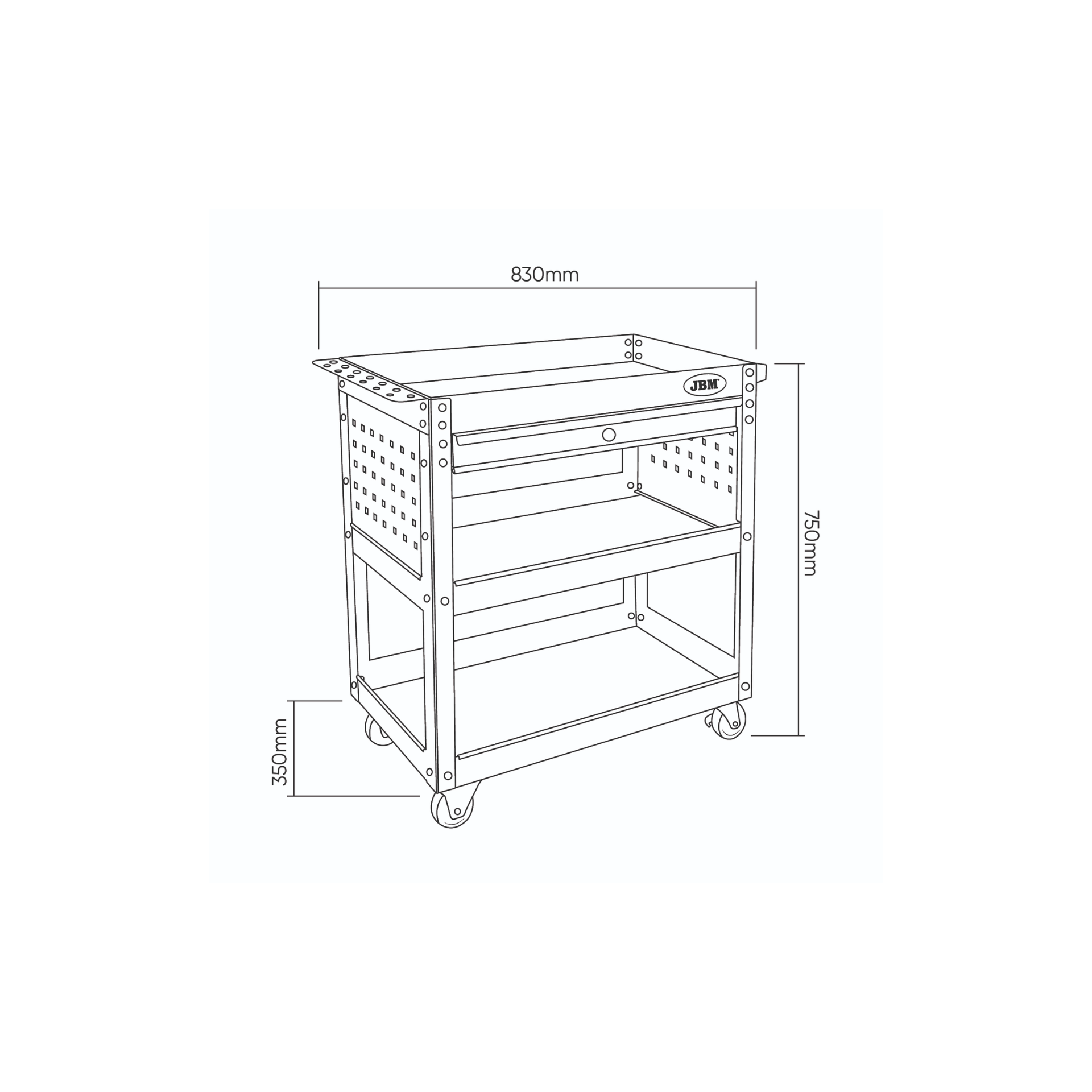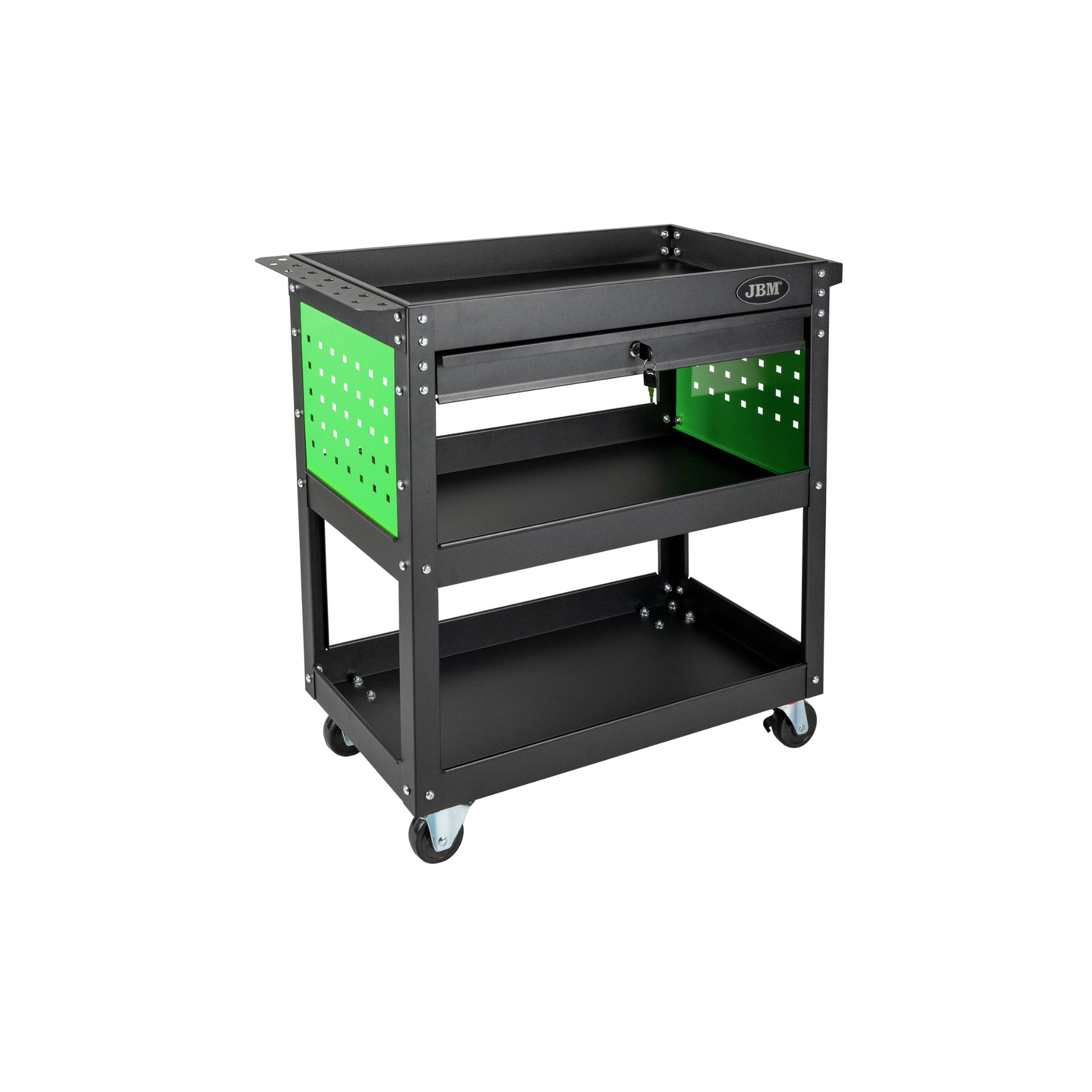O carrinho oferece uma combinação de tabuleiros abertos e uma gaveta. As suas rodas giratórias facilitam a deslocação do carrinho em diferentes superfícies