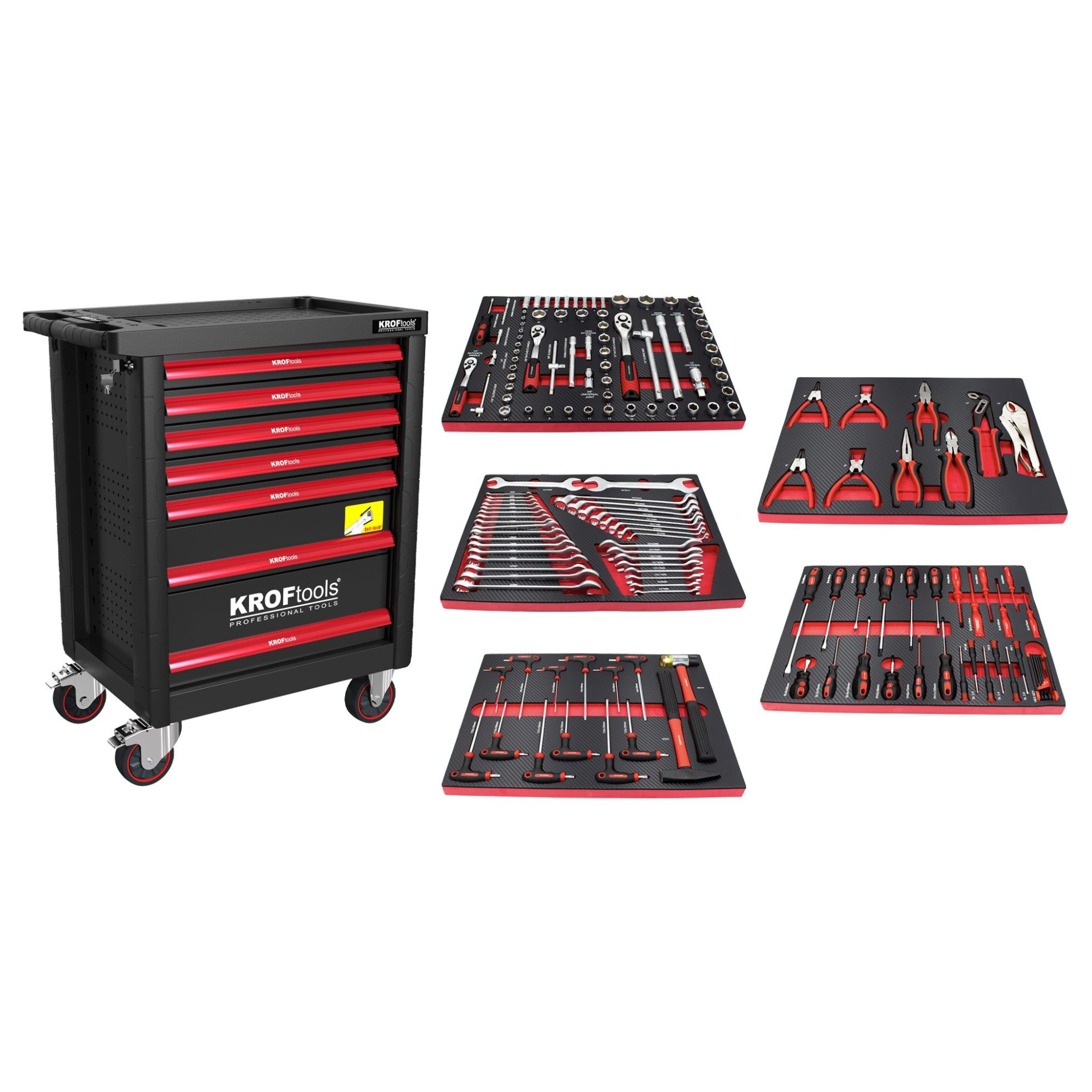 Carro de Ferramentas Preto, 7 gavetas e 160 peçasC06 8621Manufacturer: Kroftools Availability: Out of stock 0.00 € incl tax Qty: Add to cartAdd to compare list Solicitar Cotação }Descrição:Carro para ferramentas com 7 gavetas4 rodas de 5": 2 fixas e 2 giratórias (com travão)Peso máximo: 450kgDimensões do armário (CxLxP): 770x465x970mmDimensões da caixa (CxLxP): 790x490x860mmDimensões gavetas:5 gavetas pequenas: 544x399x58mm (peso máximo: 15kg)1 gaveta média: 544x399x128mm (peso máximo: 20kg)1 gaveta grande: 544x399x195mm (peso máximo: 20kg)Composição Módulos:1º - Módulo 68 peças chavs de caixa e roquetes 1/4", 3/8" e 1/2"2º - Módulos 35 peças chaves boca luneta, luneta, boca3º - Módulo 34 peças chaves fenda e cruz eletricista4º - Módulo 9 peças alicates5º - Módulo 14 peças martelo e chaves em T sextavado e torx