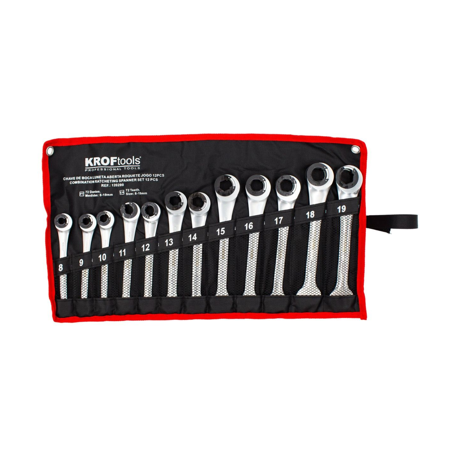 Conjunto composto por 12 chaves de boca com anel aberto de roquete.
