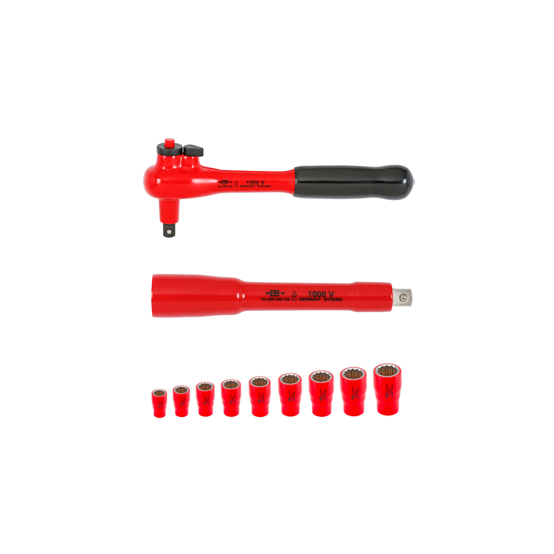 Conteúdo:Roquete VDE (3/8″) • Extensão VDE 125 mm • Chaves de caixa VDE - 8, 10, 11, 12, 13, 14, 15, 16, 17mm