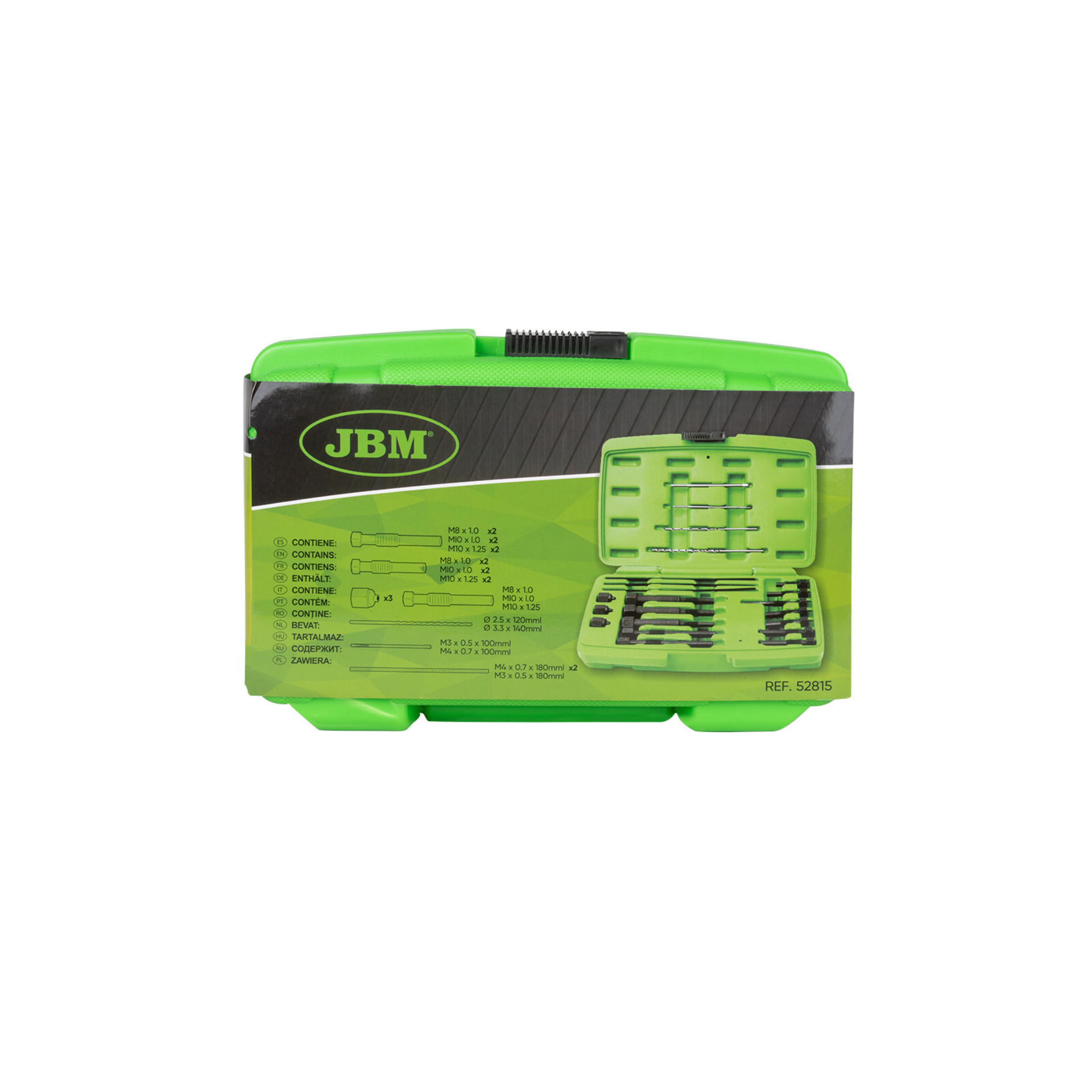 Jogo extrator de velas incandescentesJ08 52815Fabricante: JBM Disponibilidade: Desculpe, produto sem stock! 147,60 € Iva incluído Qty: ComprarAdicionar à lista de comparaçãoEnviar a um amigo Request a quote Ferramentas especialmente concebidas para remover pontas de eléctrodos de aquecimento em caso de quebra durante o processo de remoção. Contém diferentes tamanhos para uma adaptação versátil.Facilita a extração sem necessidade de levantar a cabeça do cilindro.Medidas:x2 M8x1.0x2 M10x1.0x2 M10x1,25x1 M8x1.0x1 M10x1.0x1 M10x1.25x1 M8x1.0x1 M10x1.0x1 M10x1.25x1 ø2.5x120mmLx1 ø3.3x140mmLx1 M3x0.5x100mmLx1 M4x0.7x100mmLx1 M3x0.5x180mmLx2 M4x0.7x180mmL
