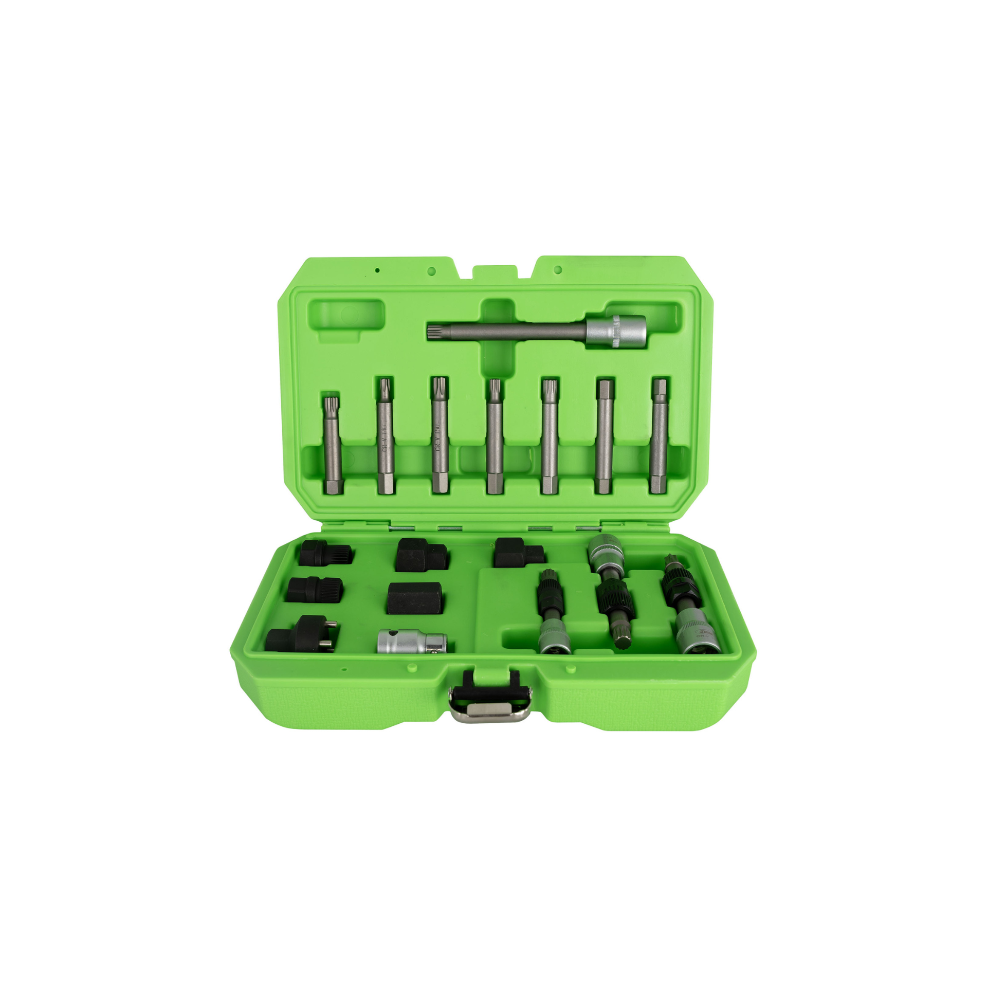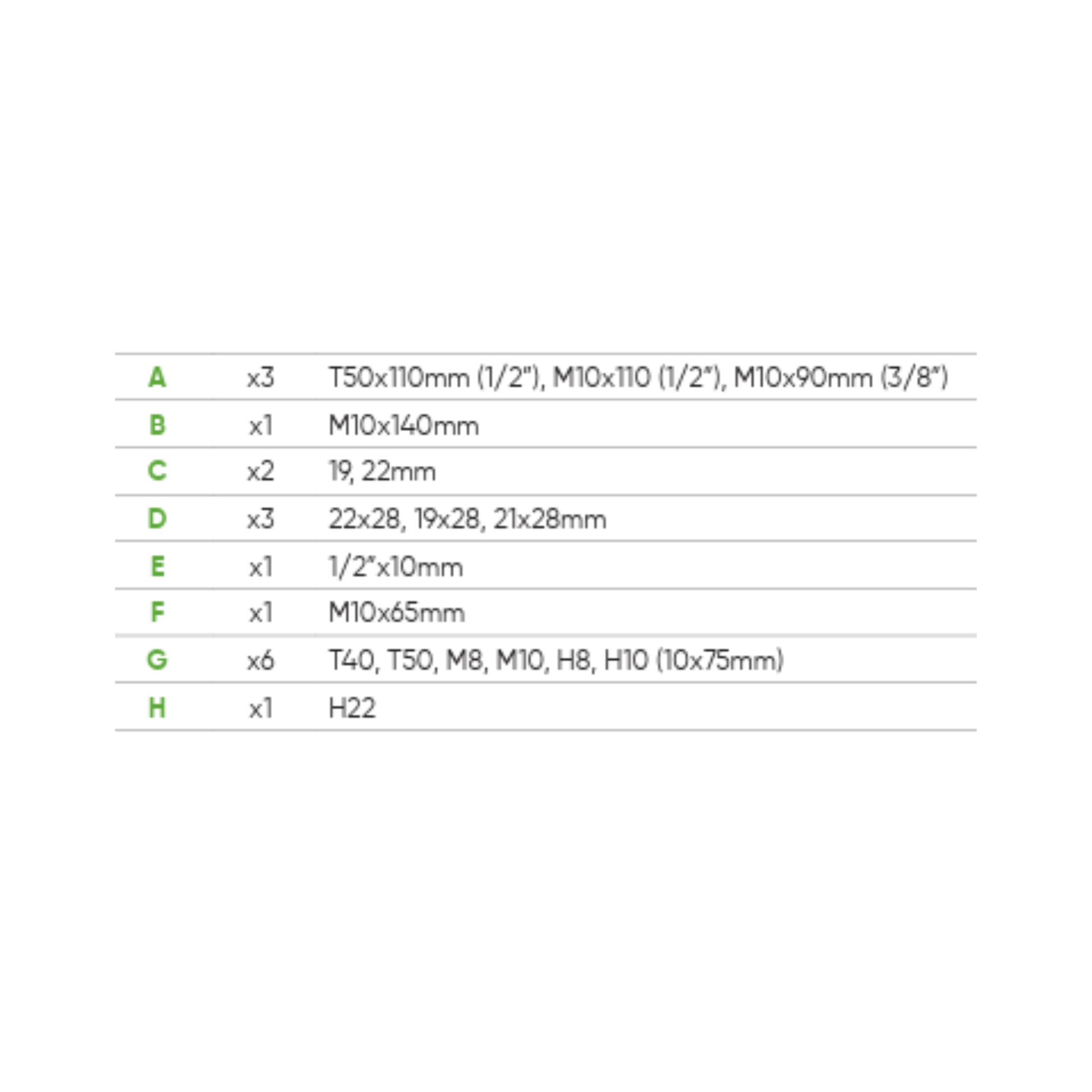 Contém:3 x Chaves combinadas: T50X113mm, M10X113mm, M10X90mm1 x Chave dentada: M10x140mm2 x Adaptadores hexagonais de 19 e 22mm3 x Chaves hexagonais: 22x28mm, 19x28mm, 21x28mm1 x AdaptadorHex. 1/2" x 10mm1 Ponta M10x12x64L6 X Pontas 10mm (varilha hexagonais) x 75mmMedidas: T40, T50, M8, M10, H8, H10